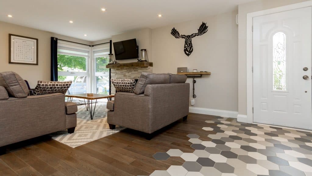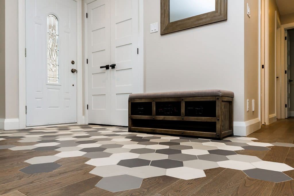 New grey-tone hardwood flooring was installed throughout the home with a detailed hexagon tile entrance that flows into the hardwood providing a dramatic transition point.