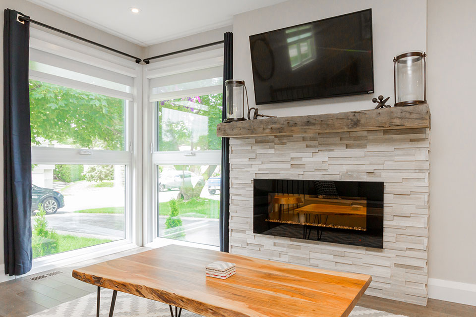 The wood-burning fireplace was completely updated with stone laminate and a reclaimed wood mantle providing a sense of new and old-world charm.