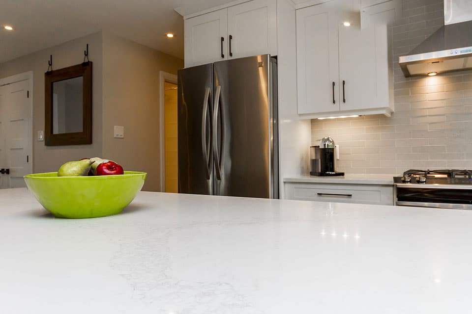 A sense of space was created by removing walls in the front entrance, main living area and kitchen. The kitchen was further enlarged by relocating the stairs to the outside wall. All new cabinets and island were installed with gleaming quartz counter-tops. A tile backsplash and stainless steel chimney range hood compliment the cabinets.