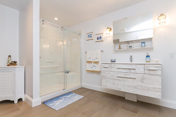 The client wanted to expand their living space by taking advantage of their unfinished basement. This fully finished basement has a beautiful 3 piece bathroom with a wall hung vanity, acrylic shower with glass doors and porcelain floor tile.